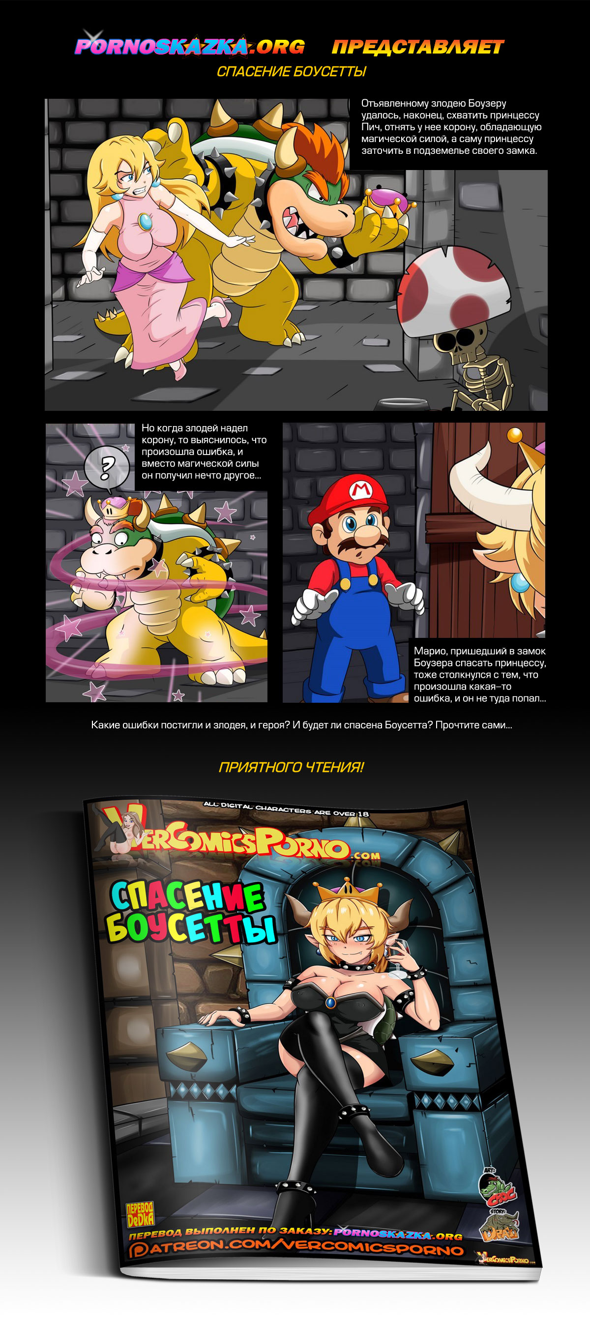 Отъявленному злодею Боузеру удалось, наконец, схватить принцессу Пич, отнять у неё корону, обладающую магической силой, а саму принцессу заточить в подземелье своего замка. Но когда злодей надел корону, то выяснилось, что произошла ошибка, и вместо магической силы он получил нечто другое… Марио, пришедший в замок Боузера спасать принцессу, тоже столкнулся с тем, что произошла какая-то ошибка, и он не туда попал… Какие ошибки постигли и злодея, и героя? И будет ли спасена Боусетта? Прочтите сами…